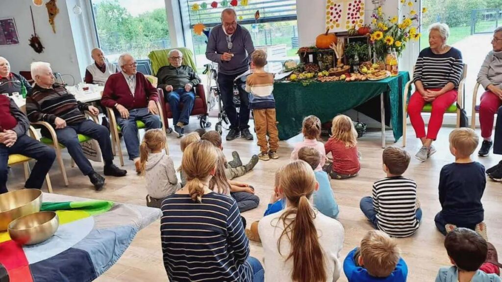 Der Erntedankaltar bot alles, was die Natur wieder für die Menschen bereithält. Obst und Gemüse, Blumen, Getreide, Blumen, alleszusammen ein farbenfrohes Arrangement, Labsal für Leib und Seele. Es war ein „Second-Hand-Arrangement“, denn all die Gabenkamen von der Erntedankfeier in der Stadtschwarzacher Pfarrkirche Heilig Kreuz. So waren alle miteinander als große Gemeinschaft zusammen mit den Kindern vernetzt. „Da, mein Urenkel“ – welch eine Freude brachten die Kindergartenkinder in die Räumlichkeiten mit Mainblick. „Einfach spitze, dass du da bist“ – „Gottes Liebe ist so wunderbar“ – da war Mitsingen und Bewegung angesagt wie auchbeim Tanz: „Regenbogen buntes Licht“ wo auch alle Seniorinnen und Senioren ein buntes Tuch bekamen und mittaten.