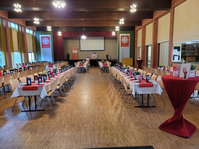Ein herzliches „Grüß Gott“, rief Domkapitular Clemens Bieber den zahlreichen Gästen zu, die sich nach einem festlichen Umzug mit Rhöner Blasmusik im Dekanatszentrum eingefunden hatten. Er freue sich sehr, dass erstmals die Regierungspräsidentin der Einladung folgen konnte. Namentlich erwähnte Bieber Dr. Martin Riß, Geistlicher Direktor des Dominikus-Ringeisen-Werks, der eigens aus Ursberg (Schwaben) angereist war. In ökumenischer Verbundenheit hieß Bieber Pfarrer Michael Bausenwein willkommen. Die Anwesenheit von vielen Landtagsabgeordneten, Bürgermeistern und anderen Vertreterinnen und Vertretern der Politik zeige die enge Verbundenheit in der Sorge um die Menschen, so der Vorsitzende des Caritasverbandes.