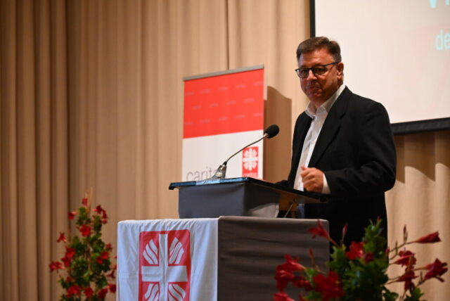 Harald Funsch, Geschäftsführer des Orts- und Kreiscaritasverbandes Kitzingen, nutzte in seinem Grußwort die Gelegenheit, allen zu danken, die sich für Menschen engagierten. Er selbst sei froh über die vielen Mitarbeiterinnen und Mitarbeiter, die seit 50 Jahren den Dienst der Caritas in Kitzingen erst ermöglichten. „Lasst es uns weiter tun, weil das Motto ‚Not sehen und handeln‘ bleibt.“ Funsch wünschte zum Ende seines motivierenden Grußes: „Gehen Sie am Nachmittag hoffnungsvoll wieder in den Alltag zurück.“