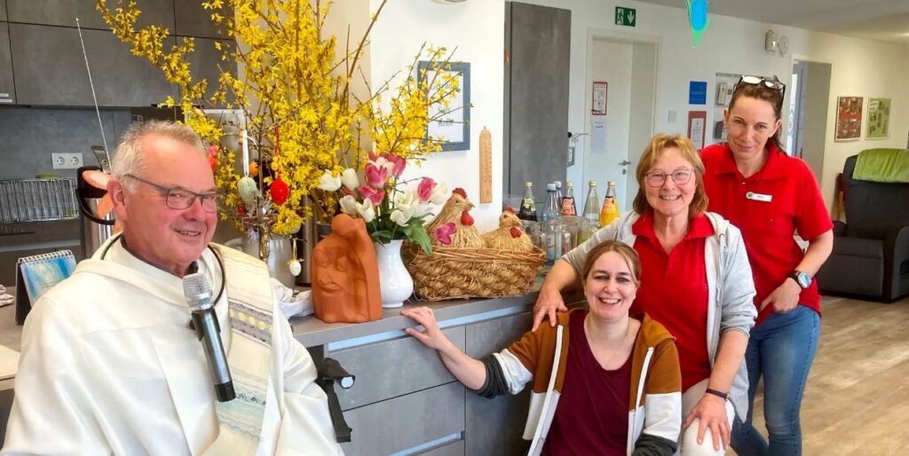 Foto: Irene Kaingu – Um den „Schutzmantel des Heiligen Josef mit Maria und Ziehsohn Jesu“ (kleine Tonfigur in der Mitte) die Mitarbeiterinnen (von rechts) Tanja Mund, Claudia Roßmark Klein und Susanne Kirchner mit Diakon Lorenz Kleinschnitz in der Senioreneinrichtung in Gerlachshausen..